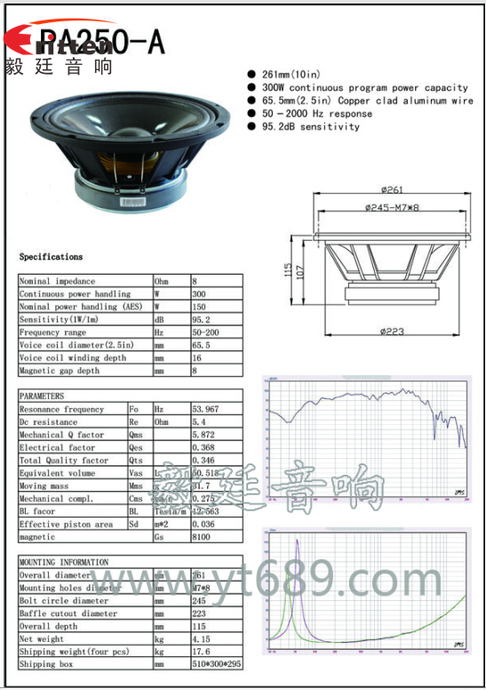 此款超級重低音揚聲器,廣泛應用10寸專業舞臺喇叭上,它的額定功率達到150W,超高靈敏度,超大功率,的防水防潮喇叭,聽感厚實,音色飽滿,客戶的首選產品。