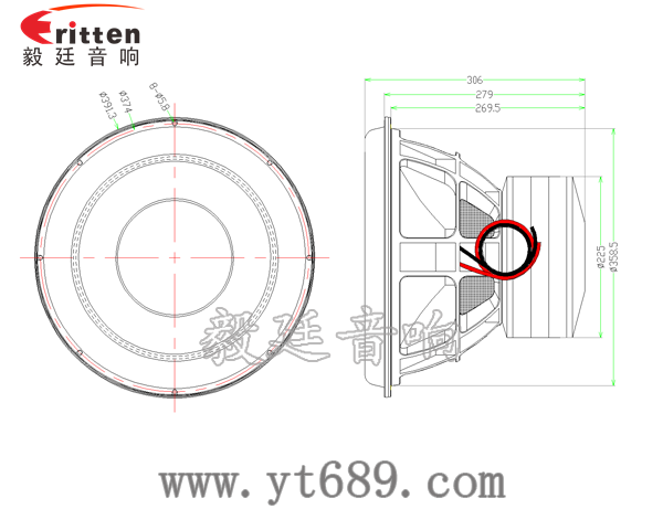 15寸圓形鑄鋁盆架重低音喇叭,采用了超大的磁體Φ225X25mm磁性強(qiáng),給喇叭提供了飽滿的動力。