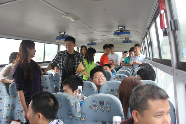 車漸漸的開起,兩位主持人在車開往高速路上時,車平穩(wěn)了,人就活動起來了,都踴躍參與其中,輸了那位同事10秒鐘吃一根香蕉,游戲火熱中···↓