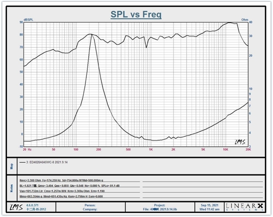 在這張圖中,阻抗的范圍是 3 Ohm 到 40 Ohm。這條線表明喇叭的負載特性,幫助工程師判斷如何設計音箱和功放電路。
