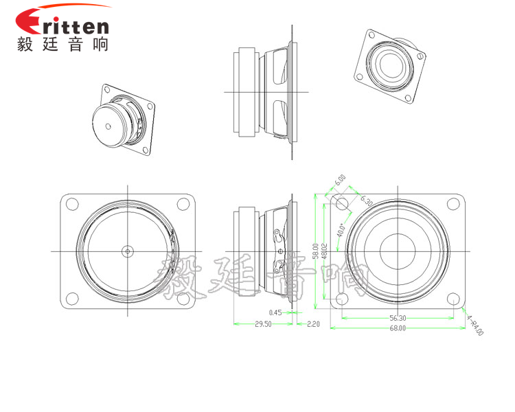 58mm方型銀色鐵盆架外磁全頻喇叭,采用的是高性能、高密度鐵氧體,磁性強、靈敏度高,使音質清晰自然;