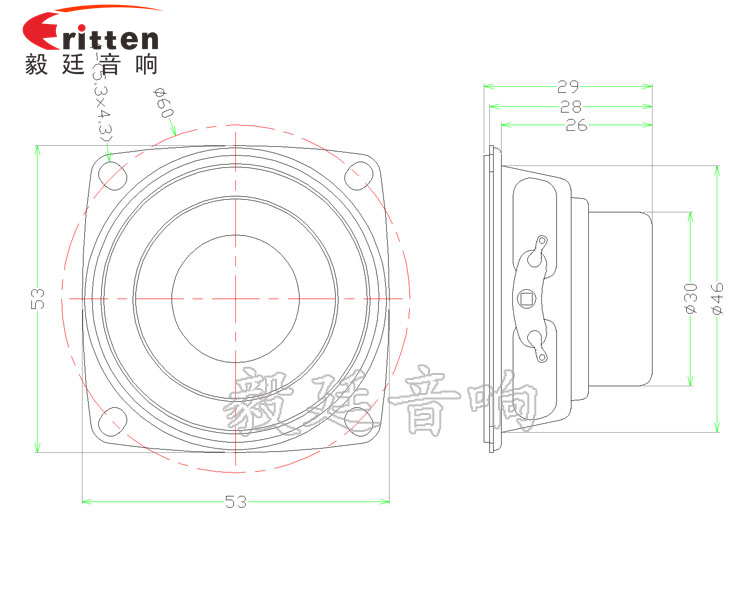 53mm方型鐵盆架內磁喇叭,采用的是高性能稀土高強磁,功率大,音色飽滿、清晰;