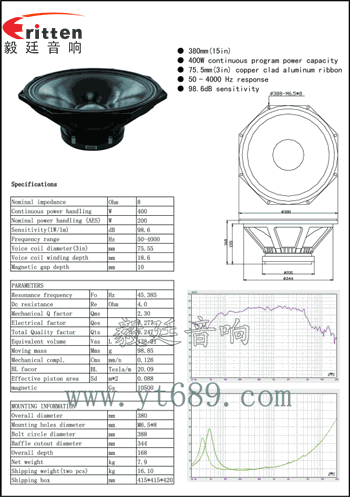 15寸異型鋁盆架外磁重低音喇叭,采用的是涂覆黑色防氧化漆,設計精簡牢固穩重實用;