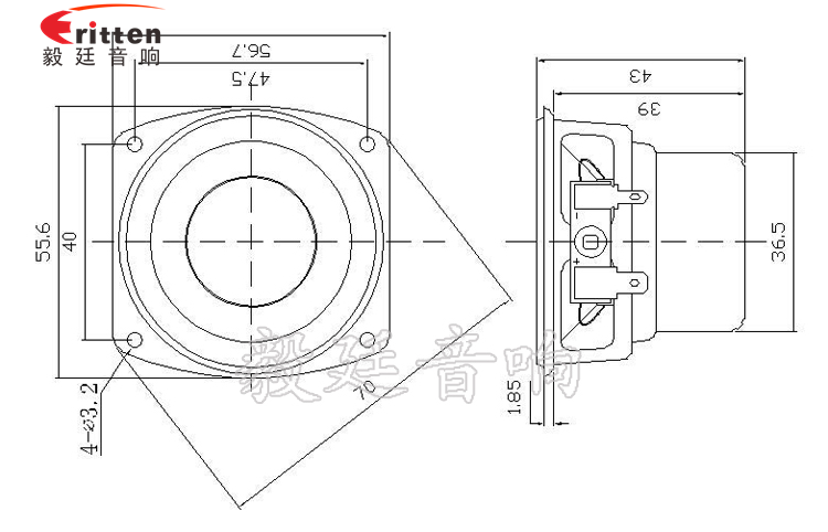 56mm異型鐵盆架內磁全頻喇叭,采用的是高品質稀土高強磁,使音色完美,飽滿;