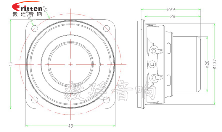 45mm方形鐵盆架內磁全頻喇叭,采用稀土高強磁磁鋼,密度高,磁性強,使音色清晰、飽滿;