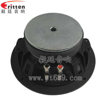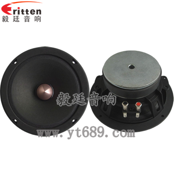 6.5寸圓形塑料盆架外磁中低音喇叭,高級鋁材整體鑄造,再經精密的車削,最后涂覆黑色烤漆,精巧細致的設計,使得盆架格外強韌穩固,銅材質鍍金按壓式接線端子,配上紅黑正負極之分,接線方便。
